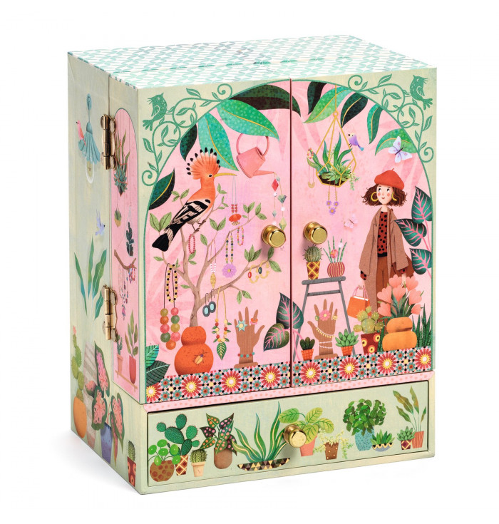 Jardin secret is a beautifully illustrated music box with three drawers in which to keep jewels and secrets. Turn the handle, open the doors of this pretty shop and...surprise! A finely sculpted maiden twirls and reflects in a shaped mirror to the sound of the music of Carl Maria Von Weber's "Invitation à la valse"