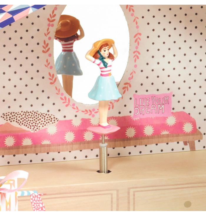 A small sculpted ballerina begins to dance in front of the shaped mirror, to the tune of "The Magic Flute" by Wolfgang Amadeus Mozart.