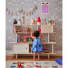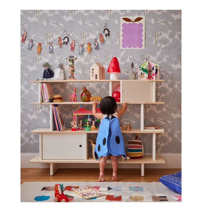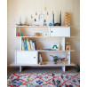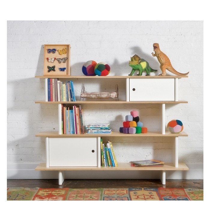 Coordinates with all other Oeuf furniture, with shelves with birch or walnut finish and dividers, uprights and doors of the closed compartments with white lacquered finish.