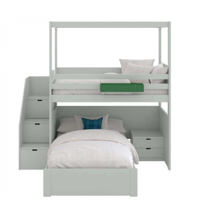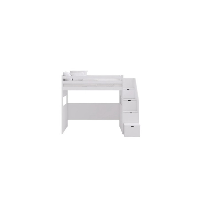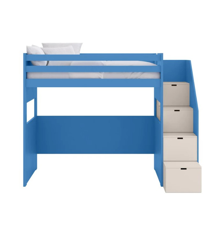 The loft bed has a light and cheerful line; the two side windows in the lower bed allow you to look around and play like in a playhouse. The version with drawers instead of the ladder also allows you to have handy containers for toys, puppets or blankets. The bed is equipped with wooden slats.