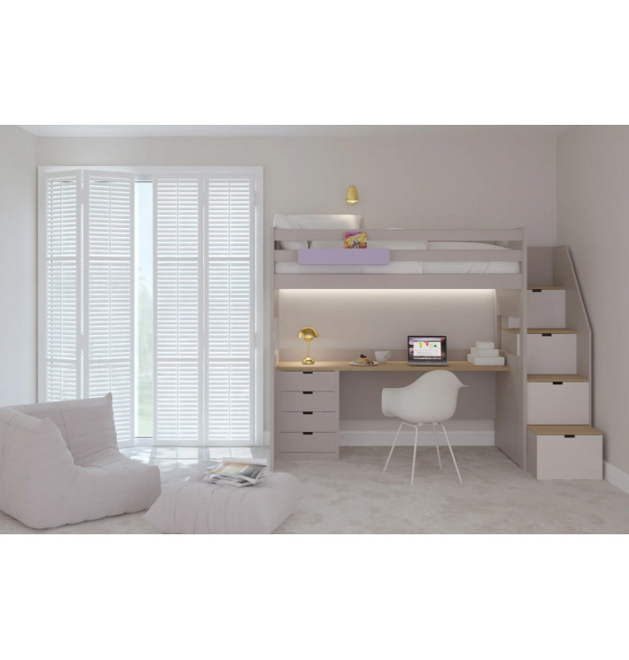 This version includes a loft bed and a chest of drawers.