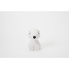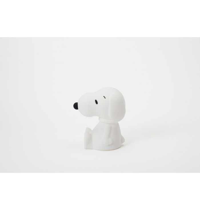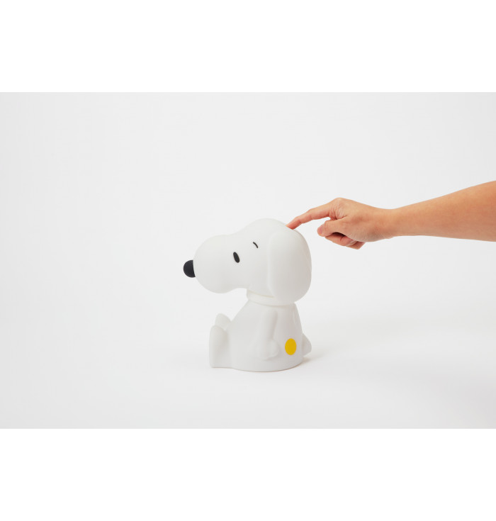 The "Snoopy First Light" lamp is a rechargeable and dimmable LED night light featuring an iconic all-white Snoopy design.
