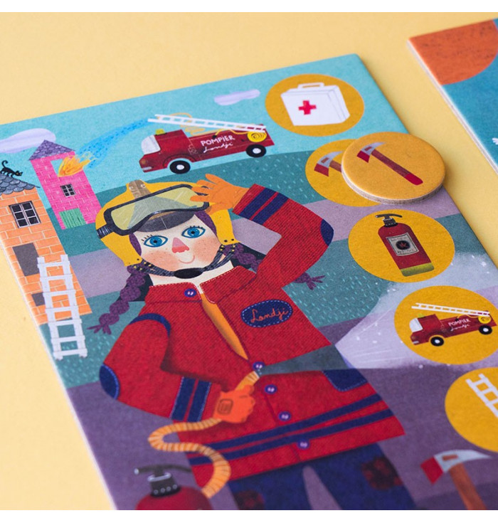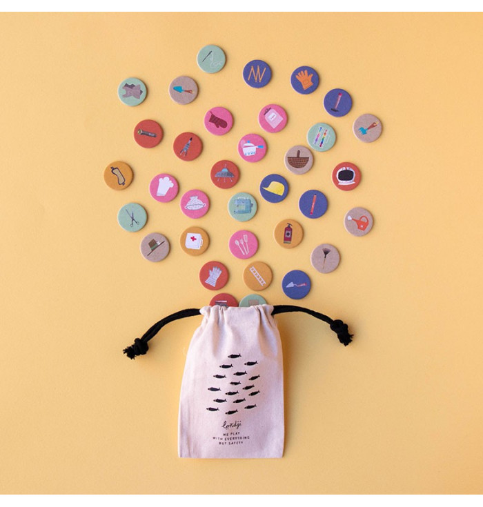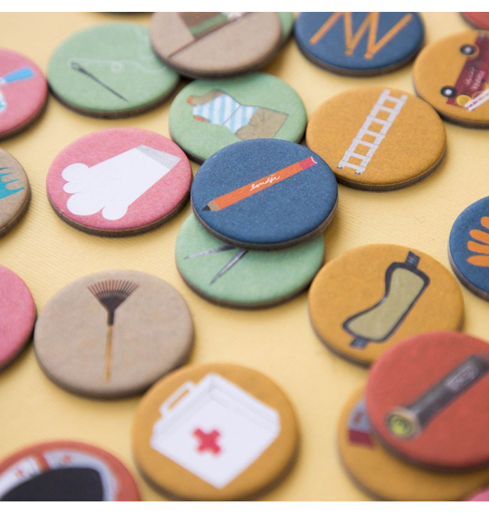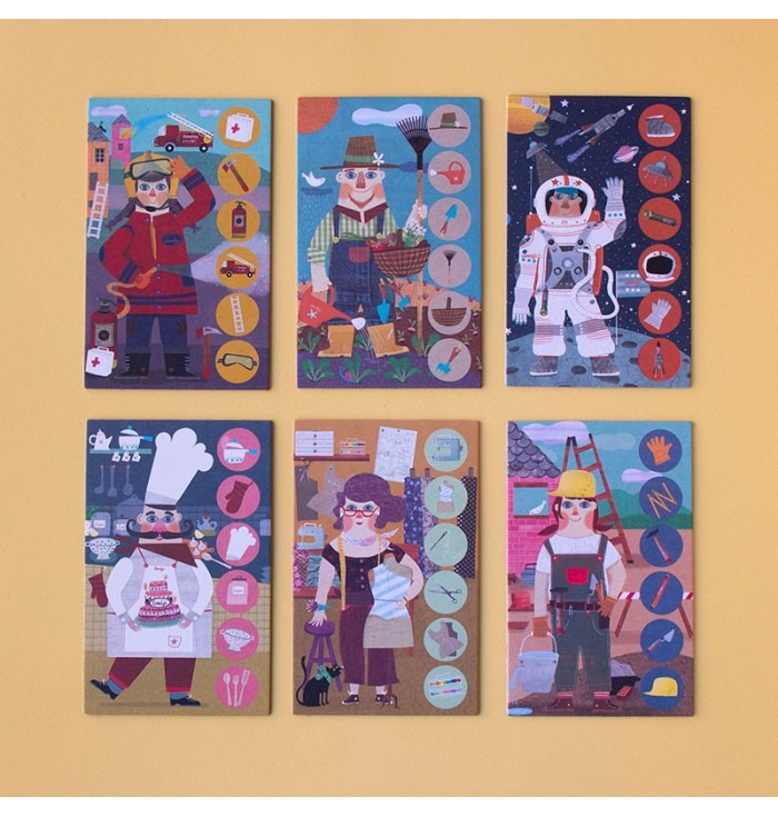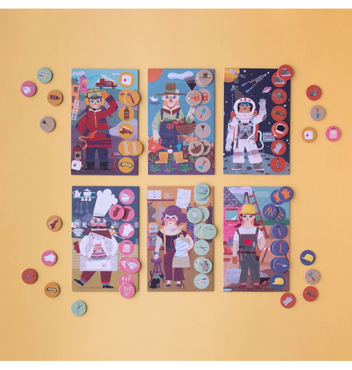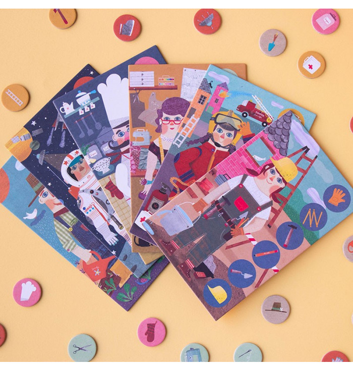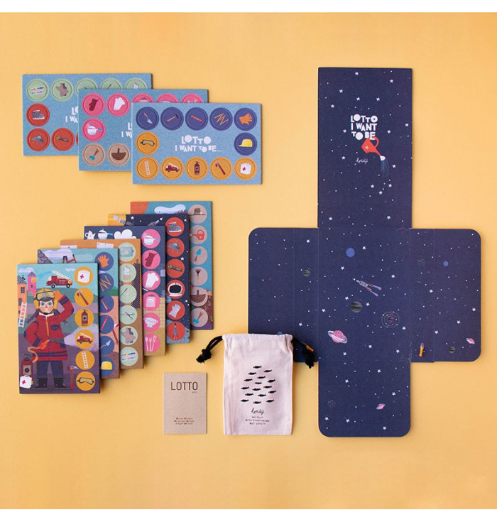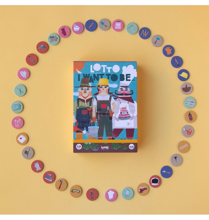When I grow up, I want to be... In the world of Londji, there are many different types of professions. They are all equally important and exciting. With this lottery game, gardeners, construction workers, astronauts, firefighters, artists, chefs, and stylists invite us to discover more about their work as we play! Cards with illustrations of characters from different professions are distributed among the players. In turns, starting with the youngest members of the family, they turn over the chips with images of the tools characteristic of each profession. If one of the players has drawn the tool on their card, they place the chip on top of their card. The first to complete their card wins the game! A toy free of gender stereotypes and a very fun way to learn different professions. A lottery game with different professions to play with the whole family. Includes thirty-six chips and six recycled game boards. A sustainable toy free from gender stereotypes.