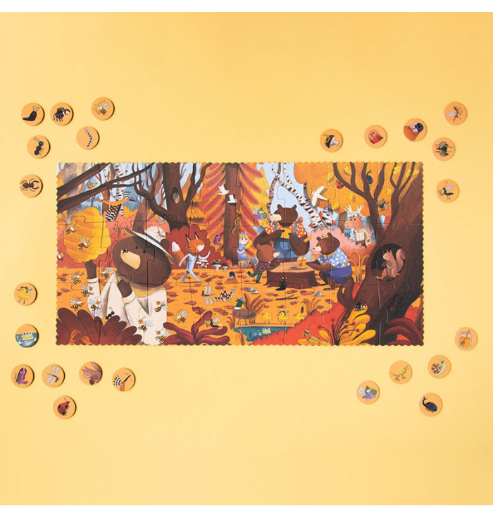 A 24-piece puzzle for young children and an observation game. Discover the forest and the animals that inhabit it!