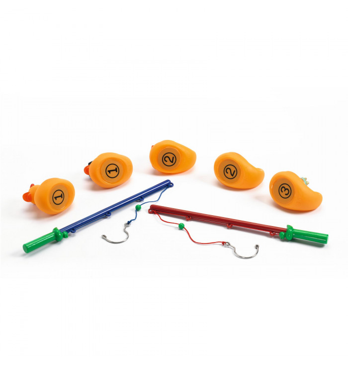 A fishing game that includes 2 fishing rods and 5 cute ducks.