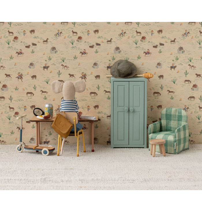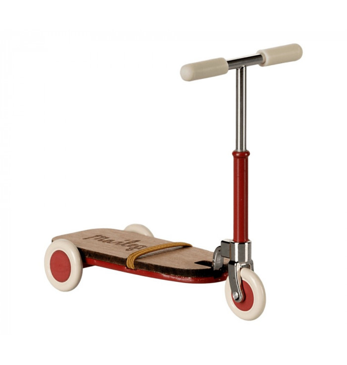 A scooter with wooden details. It features a metal stick on the handlebars that allows the magnetic hands to stay on the board. A small elastic band has been added to the deck to secure the feet while riding.