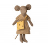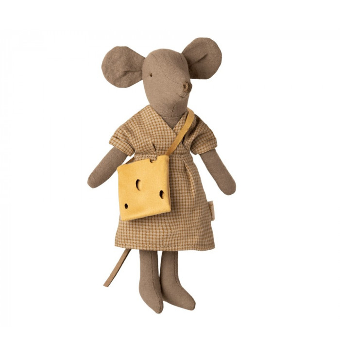 Mother mouse with a light brown fabric body. She wears a dress and a cheese-shaped bag. Fits mouse-sized furniture and accessories. Additional clothing items can be purchased separately, suitable for the mother/father mouse.