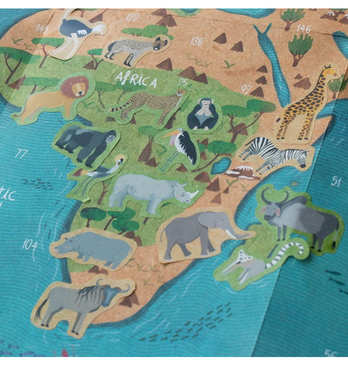 Discover the world's animals by sticking animal stickers on the map and matching the numbers. An activity to learn about the species that share this great blue planet with us.