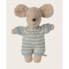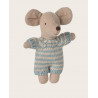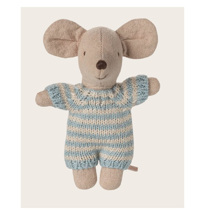 A sweet little baby mouse dressed in a soft, striped knit onesie.