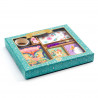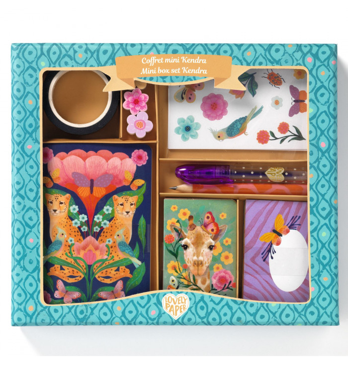 Contents: 1 box with window (18 x 15.5 x 3 cm) with 15 mini cards + 15 mini envelopes + 4 sheets of stickers + 1 adhesive tape + 1 gel pen + 1 pencil + 3 erasers + 3 minis notebooks.