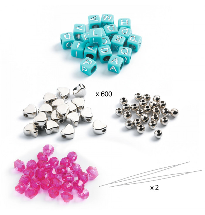 Contents: 600 alphabet and colored beads, 400 intermediate beads, two 5-meter elastic strings, and two needles.