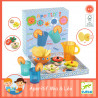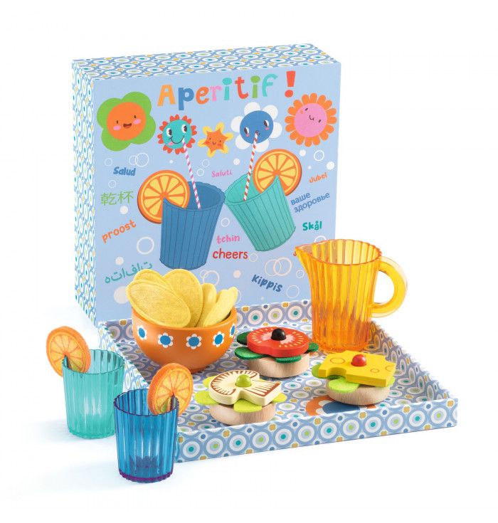 The lid transforms into a tray on which the child can arrange and carry the bowl of chips, the two cocktail glasses decorated with an orange slice, three sweets to compose with six ingredients, and a carafe.