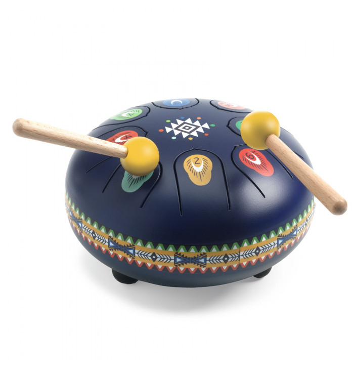 Contents: 1 steel drum, 16 cm in diameter, with 8 tongues, 2 small wooden sticks (8.5 cm long) with 2 cm rubber tips, 2 double-sided cardboard sheet music (18 x 8.5 x 0.2 cm).