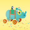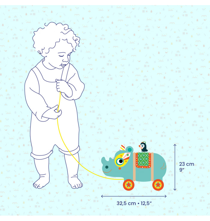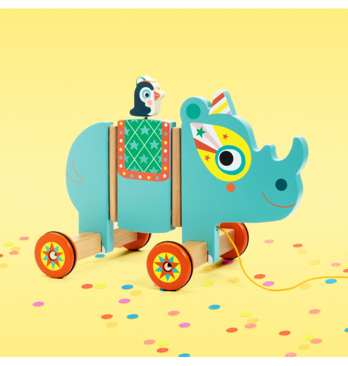Vilma is a small, brightly colored rhinoceros-shaped pull-along toy with a little penguin on its back. It moves when you pull its ribbon.