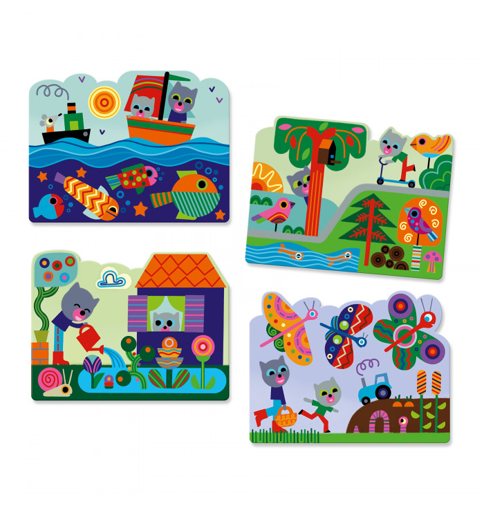 Contents: 4 illustrated flexible plastic boards with a Disappearing whiteboard, a pencil with a water reservoir, and a thick cardboard stand.