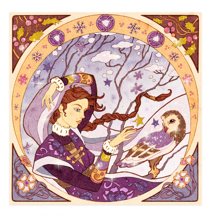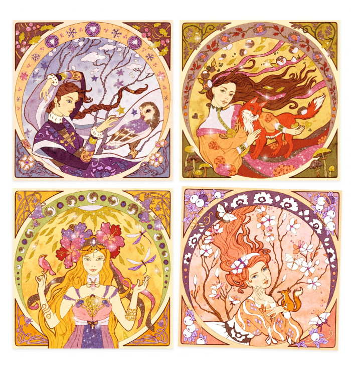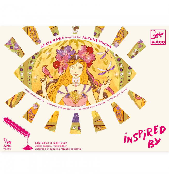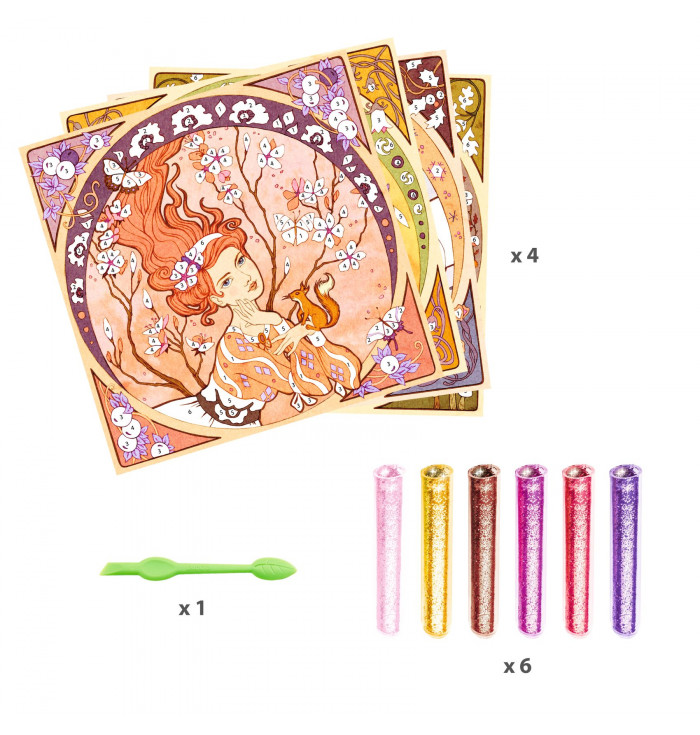 Divines – Glitter Art Activity Inspired by Alfons Mucha A sparkling journey through art and beauty! With Divines, children (and adults too!) can create stunning glitter-decorated artworks inspired by the elegant, floral style of the great Art Nouveau master Alfons Mucha. Simply place the picture inside the box, use the provided tool to peel off the adhesive areas, and sprinkle them with glitter following the color guide in the booklet. The graceful female figures come to life among luminous, nature-inspired patterns. ✨ Highlights A creative way to discover the art and style of Alfons Mucha A collaboration between a contemporary illustrator and a timeless master Suitable for all ages: 7 – 99 years The illustrations shine beautifully with glitter accents A clean, mess-free activity – the box keeps glitter contained Step-by-step illustrated instruction booklet included Eco-friendly packaging made of FSC®-certified cardboard ???? Contents 4 pictures to decorate Colored glitter powders 1 tool for revealing adhesive areas 1 illustrated instruction booklet