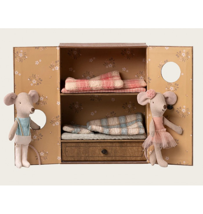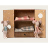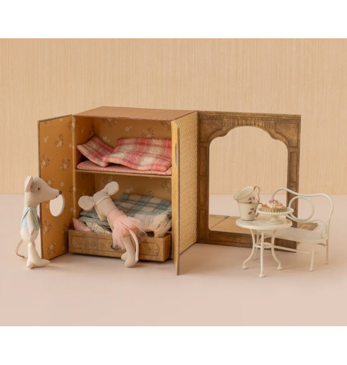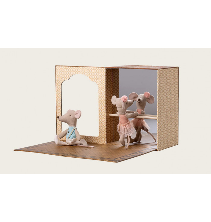 Inside you'll find a paper box that transforms into a dance studio or a cozy home for the mice, and two characters dressed in carefully crafted outfits, ready to twirl in a thousand stories.