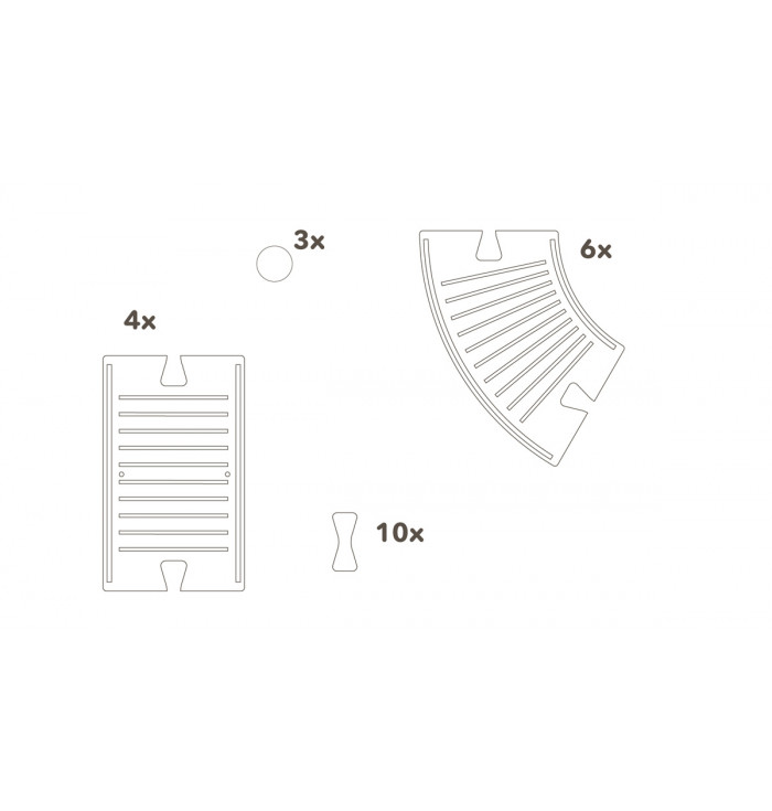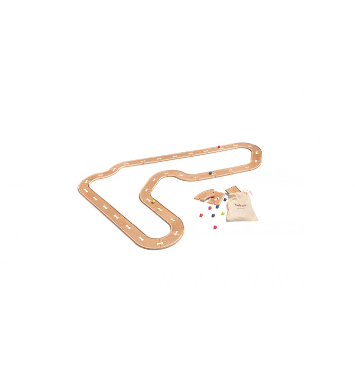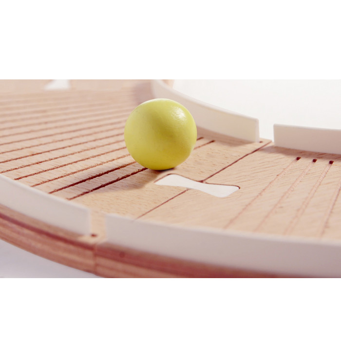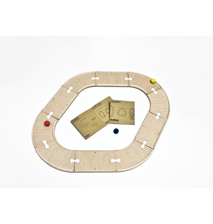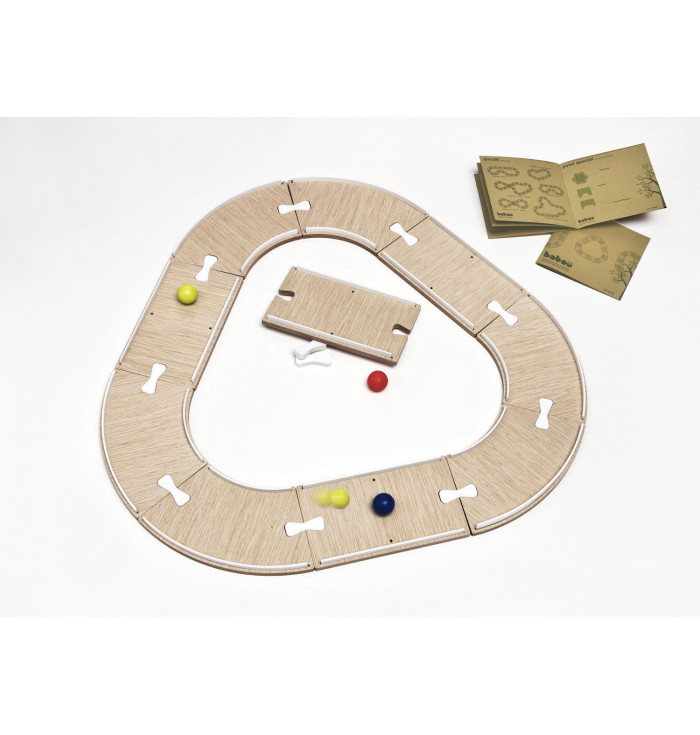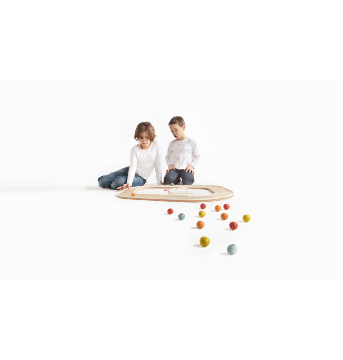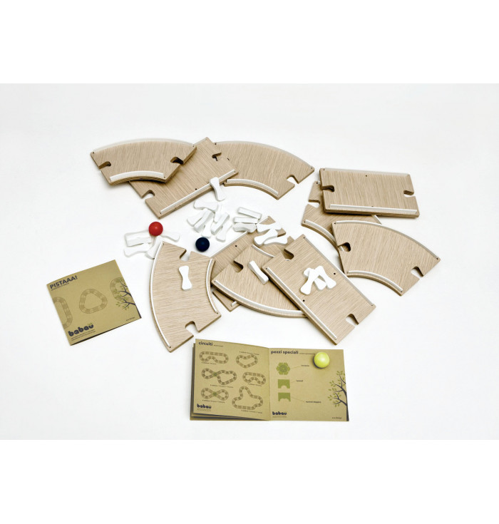 "Pistaaa!" is a fantastic marble track that can reach 2.4 meters in length in its standard configuration (6 curves + 4 straights + 2 colored marbles). Its ability, however, is to be infinitely extended, each time adding new pieces and special components (tunnels, intersections, etc.), to make your competitions with friends ever more exciting. All made of oak wood, the components can be connected together using the appropriate joints.