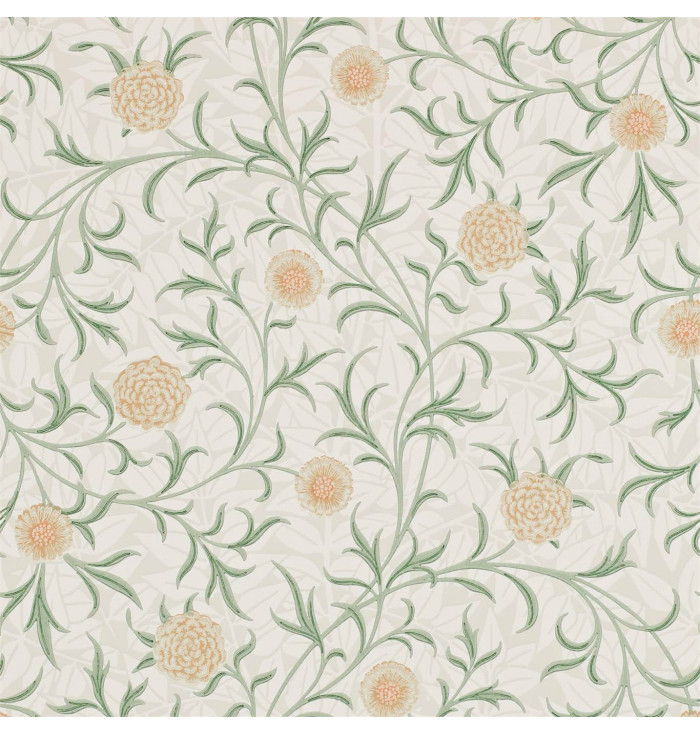 Trailing leaves and marigold flowers meander over a background of smaller leaves taken from the Branch wallpaper. Inspired by medieval book illuminations and designed by Morris in 1871, this wallpaper is infinitely useable and relaxed.