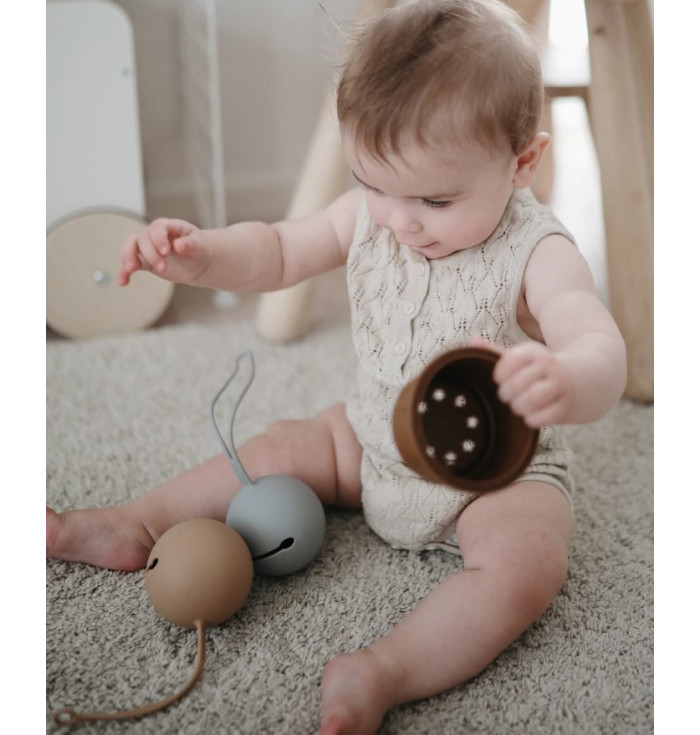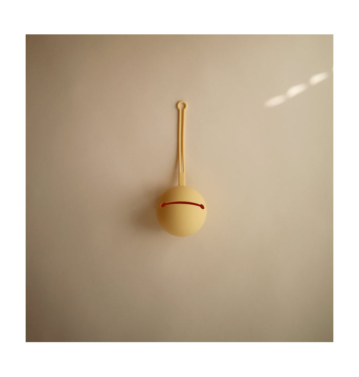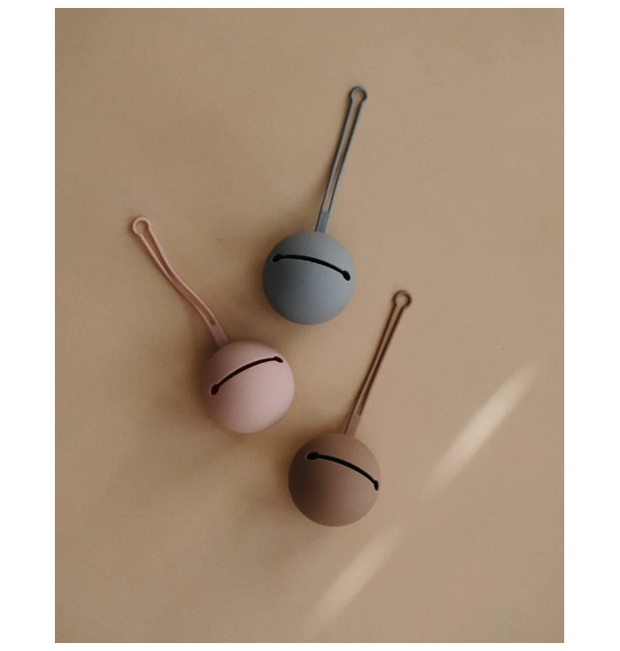 Vezzoso proteggi succhietti in silicone a forma di sonaglio vintage, dove puoi riporre fino a tre ciucci puliti e pronti per l'uso. La fascetta consente di appenderlo alla borsa o al passeggino dove tenerli a portata di mano.