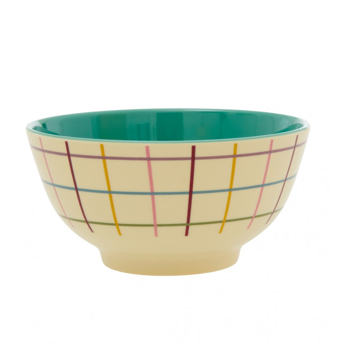 Ciotola in melamina di medie dimensioni in un delizioso color crema con un decoro a quadri multicolore all'esterno e uno splendido colore verde all'interno.