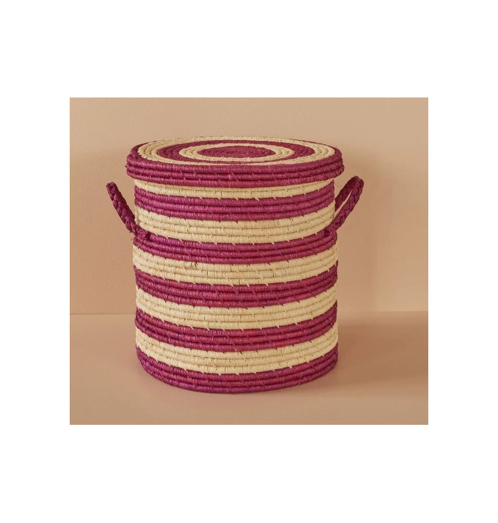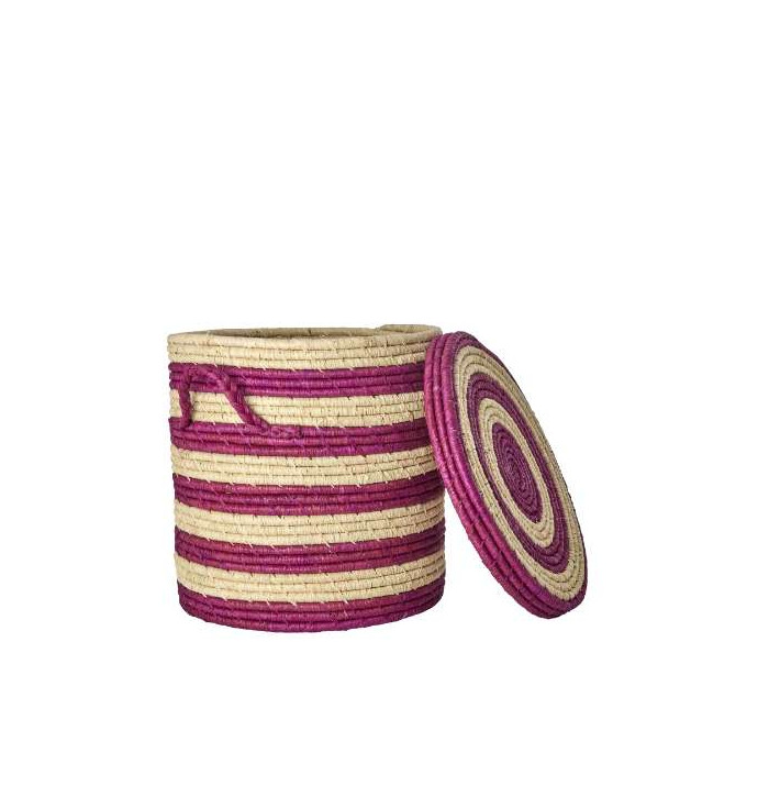 Pratica cesta portabiancheria di piccole dimensioni con splendide righe color melanzana. È fatta nel bellissimo Madagascar in materiale sostenibile, la rafia. Realizzata con una maniglia su ogni lato ed un coperchio cool. Perfetta per la biancheria sporca, ma anche molto utile per riporre giocattoli, decorazioni regalo, cappelli e guanti. La cesta è disponibile anche in una misura più grande.