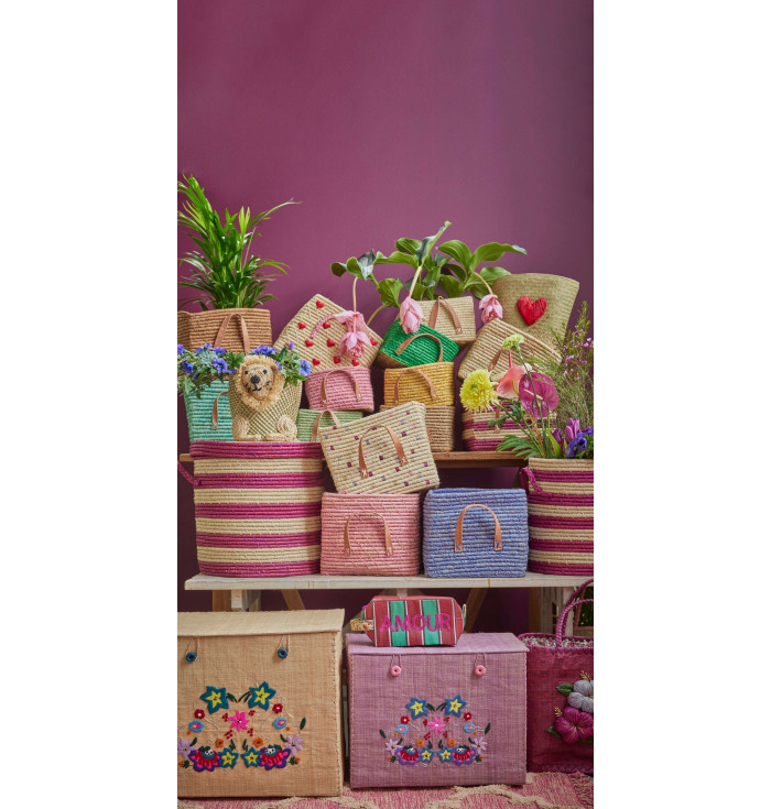 Poiché la rafia è un materiale naturale ed i prodotti sono fatti a mano, ogni prodotto può variare nelle dimensioni e questa variazione si riflette anche nella colorazione. Ciò significa che due prodotti non sono mai del tutto simili, cosa che riteniamo sia parte del fascino. Se esposta alla luce solare diretta, i colori possono sbiadire nel tempo. Il colore dei prodotti in rafia potrebbe venire via se esposti a liquidi.
