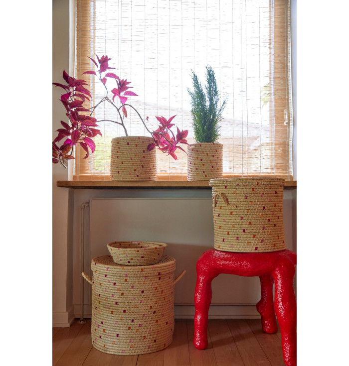 Poiché la rafia è un materiale naturale ed i prodotti sono fatti a mano, ogni prodotto può variare nelle dimensioni e questa variazione si riflette anche nella colorazione. Ciò significa che due prodotti non sono mai del tutto simili, cosa che riteniamo sia parte del fascino. Se esposta alla luce solare diretta, i colori possono sbiadire nel tempo. Il colore dei prodotti in rafia potrebbe venire via se esposti a liquidi.