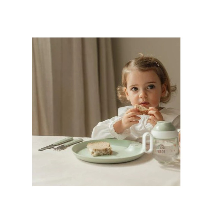 Il coltello è dotato di una lama seghettata di sicurezza su un solo lato, per garantire un utilizzo sicuro. Il manico in plastica ergonomico consente al bambino di impugnare facilmente le posatine e mangiare in autonomia.