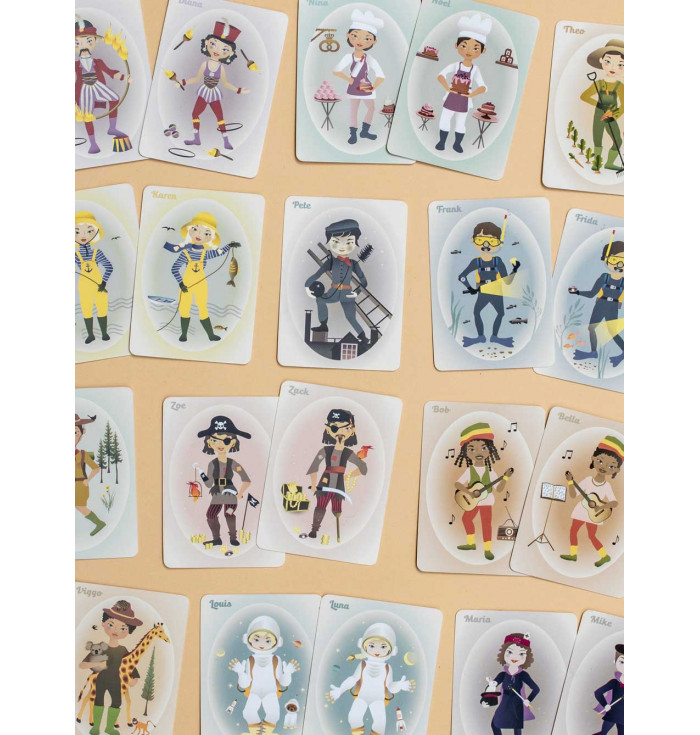 Il classico gioco Chimney Pete di ViSSEVASSE con semplici illustrazioni grafiche di un affascinante cast di personaggi. Tutte le coppie hanno occupazioni diverse (come il custode dello zoo o il giardiniere) e ogni personaggio ha un nome.