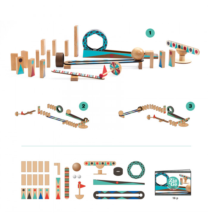 Contenuto: 1 gioco di costruzione composto da 28 elementi e 2 biglie in metallo. 1 libretto di istruzioni di 16 pagine incluso.