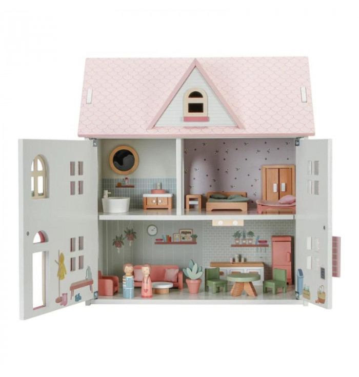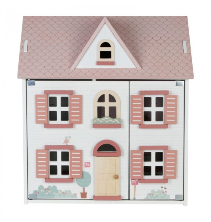 Questa bellissima casa è di colore bianco con tetto rosa e presenta persiane in legno che possono essere aperte e chiuse. Il tetto può anche essere aperto per un gioco ancora più divertente e una parte del tetto può essere trasformata in un giardino. L'interno della casa è molto dettagliato e decorato con bellissime illustrazioni, sia all'interno che all'esterno. Jim e Rosa sono inclusi nella casa delle bambole così i bambini possono iniziare subito a giocare