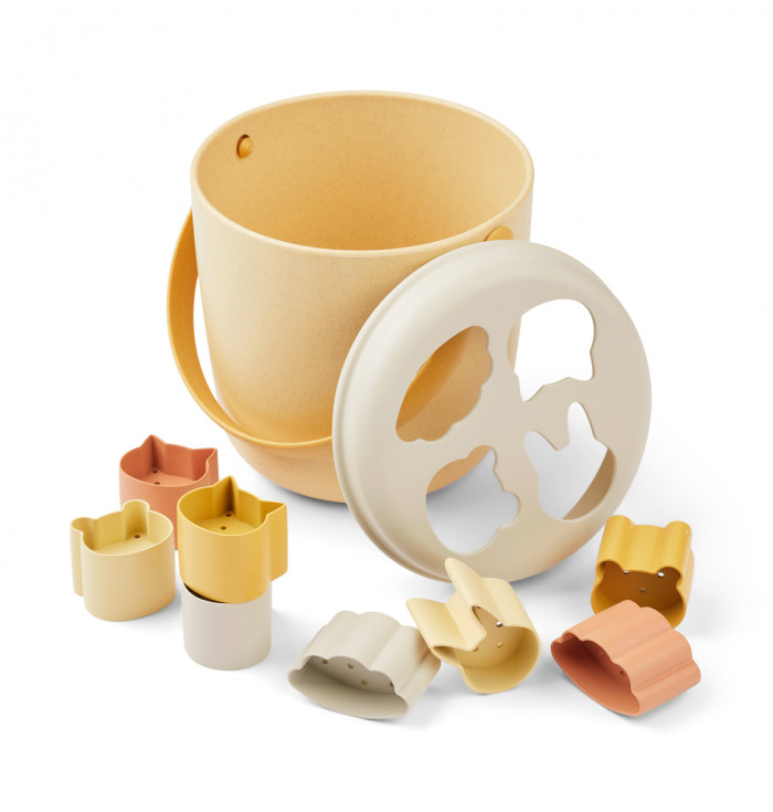 Un secchiello con coperchio e forme di animali da incastrare. Super divertente come una scatola di puzzle. Può essere utilizzato per la spiaggia, ma anche per interni. Gli stampi hanno fori in modo che l'acqua possa scorrere.