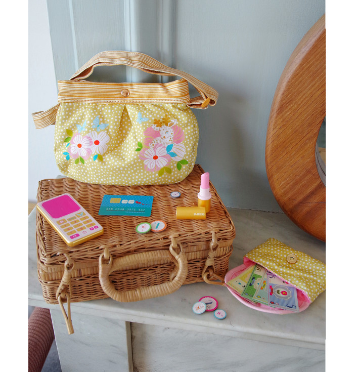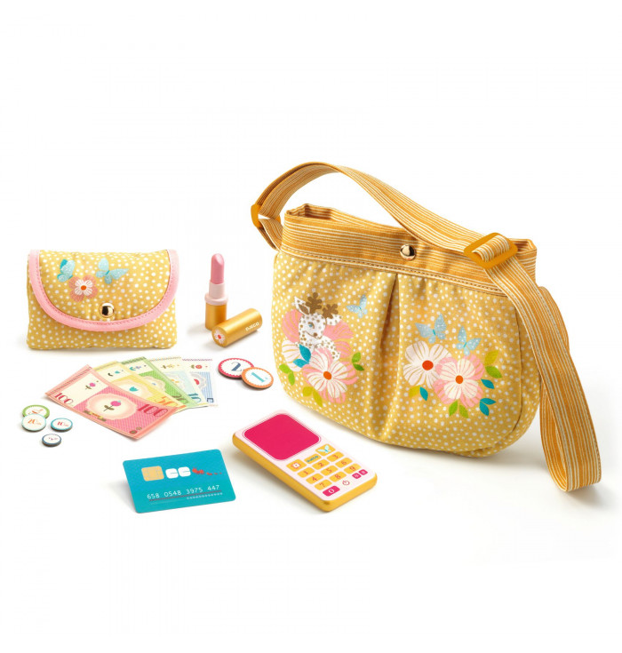 Contenuto: 1 borsa a tracolla in cotone, 1 portafoglio in cotone con chiusura magnetica, 1 telefonino in legno, 1 rossetto in legno, 5 banconote e 6 monete, 1 carta di credito..