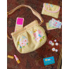 Una borsa a tracolla in cotone, graziosamente illustrata con farfalle, contenente numerosi accessori per imitare i grandi: un telefonino, un rossetto, un portafoglio per riporre le monete, le banconote e la carta di credito.