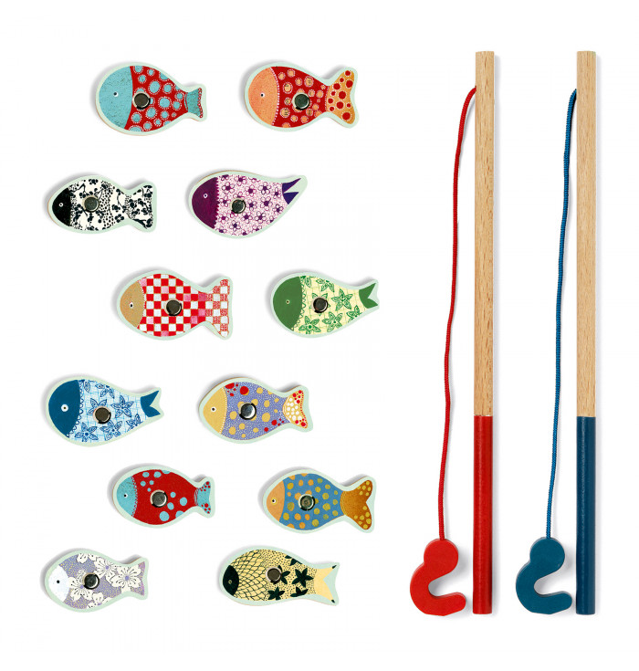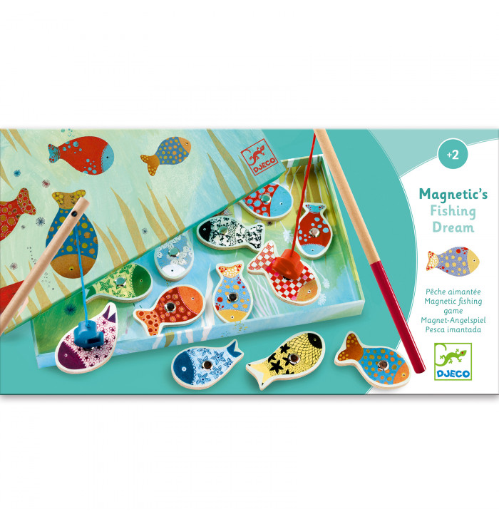 Un gioco classico e divertente con pesciolini in legno, 2 canne da pesca magnetiche e una scatola che si trasforma in fondale marino.