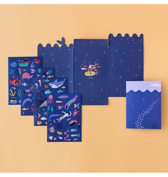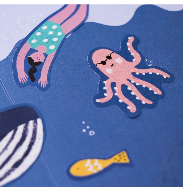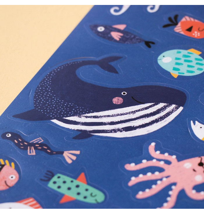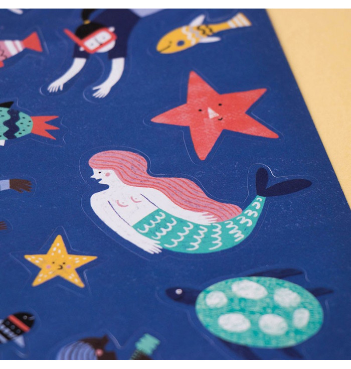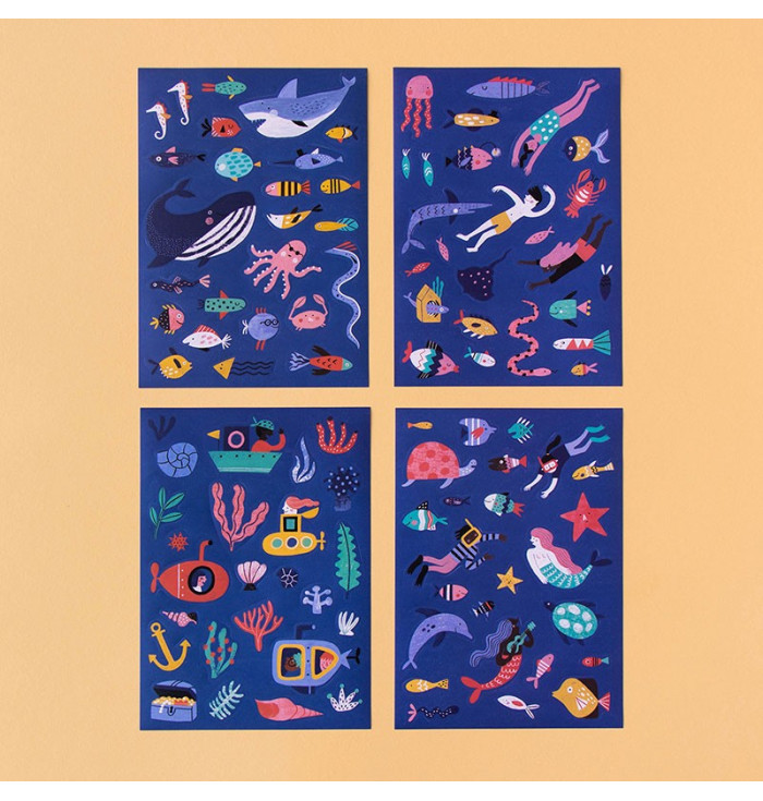 Questo set include una varietà di adesivi riutilizzabili di alghe, pesci, sirene e subacquei, perfetti per costruire il fondale marino dei tuoi sogni su qualsiasi superficie.