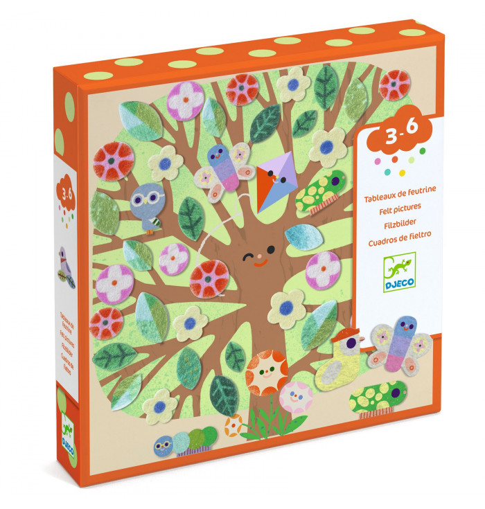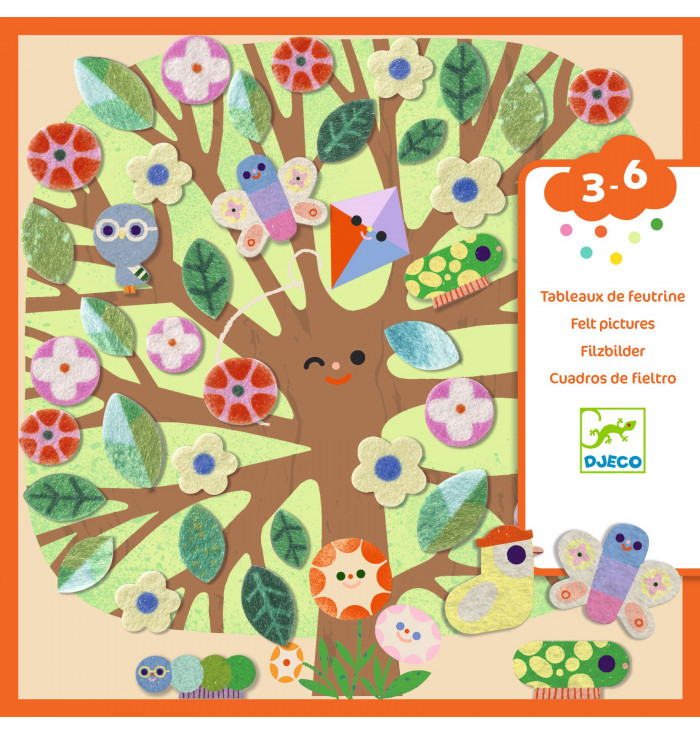Contenuto: 4 immagini illustrate (20 x 20 cm), 200 adesivi in feltro (1 foglio di adesivi per immagine) e 1 libretto di istruzioni passo passo.