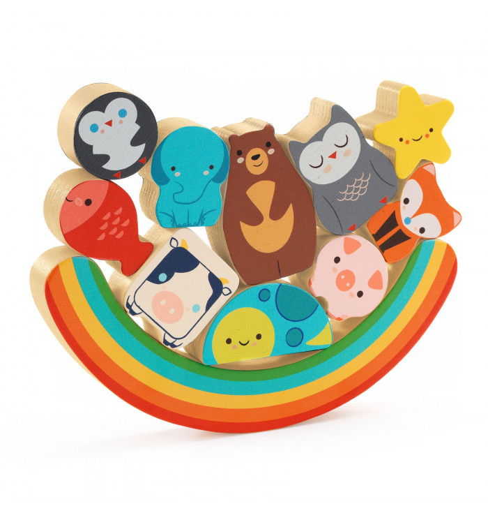 Gli animaletti in rilievo possono stare in piedi e impilarsi uno sull’altro per creare una piramide colorata sulla base a forma di arcobaleno.