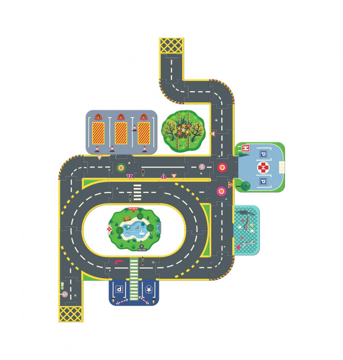Crea una grande città Crazy con 28 pezzi di pavimento e 6 elementi decorativi: ospedale, stazione di polizia, garage, caserma dei pompieri e due archi.