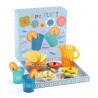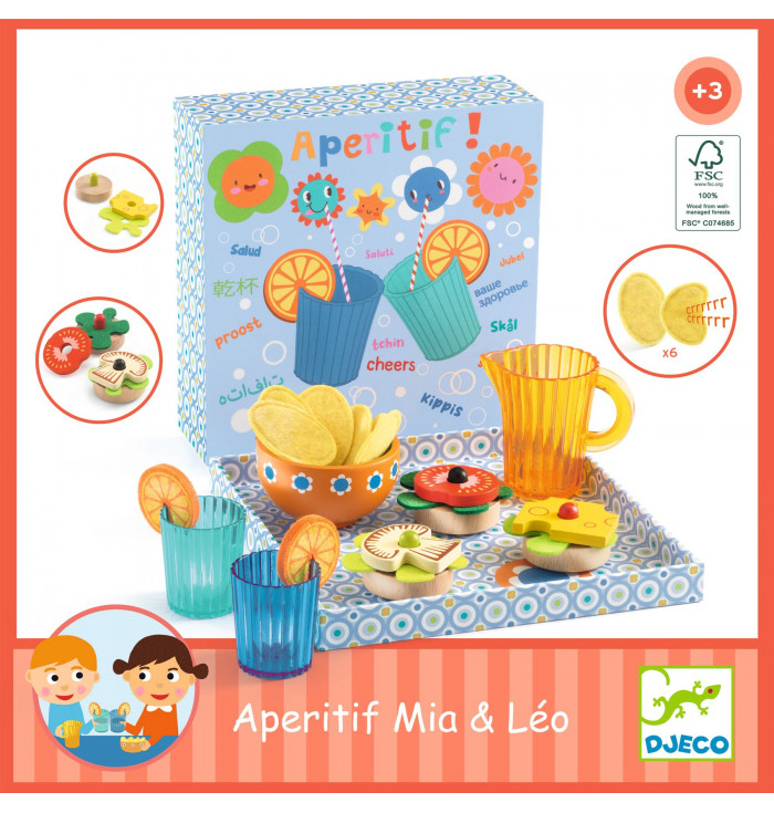 Il coperchio si trasforma in un vassoio su cui il bambino può sistemare e trasportare il bowle di chips, i 2 bicchieri da cocktail decorati con una fetta d’arancia, 3 dolcetti da comporre con 6 ingredienti e una caraffa.