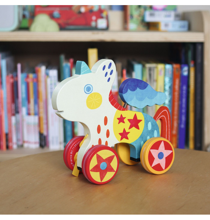 Vadim è un piccolo giocattolo da trascinare a forma di unicorno dai colori vivaci. Si muove se si tira il suo nastro.