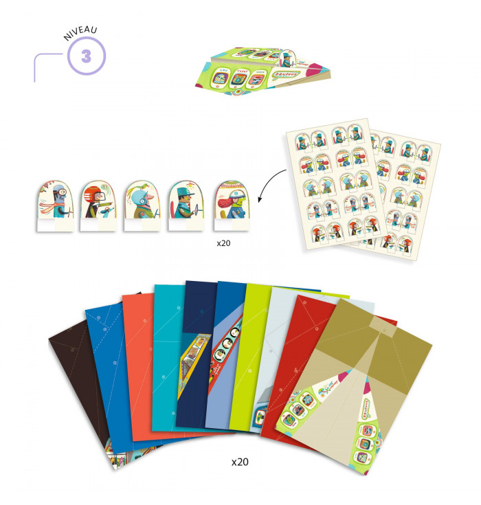 Contenuto: 20 fogli da piegare (21 x 28 cm), 20 adesivi "pilota" da attaccare e 1 libretto di istruzioni passo passo a colori.