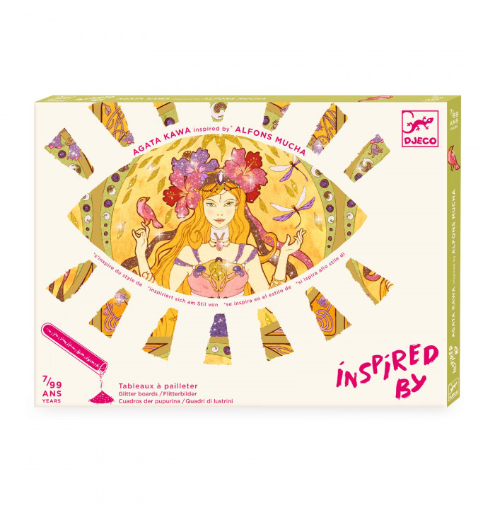 Con Divines, i bambini (e non solo!) creano splendidi quadri decorati con paillettes, ispirati allo stile elegante e floreale del grande maestro dell’Art Nouveau, Alfons Mucha. Basta inserire il quadro nella scatola, rimuovere le parti adesive con l’apposito strumento e cospargerle di brillantini seguendo il codice colore del libretto. Le figure femminili prendono vita tra motivi vegetali e sfumature luminose.