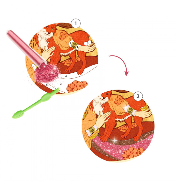 Contenuto 4 quadri da decorare Polveri di paillettes colorate 1 strumento per svelare le parti adesive 1 libretto illustrativo