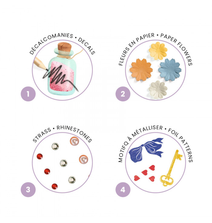 Con Au pays des merveilles, i bambini decorano ogni tavola con décalcomanie, fiori di carta, strass adesivi e motivi metallizzati. Quattro tecniche diverse per creare illustrazioni straordinarie e scintillanti, ispirate ai classici racconti e alle fiabe senza tempo.