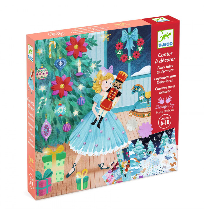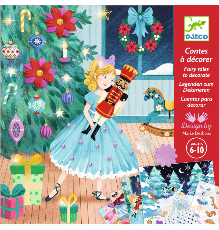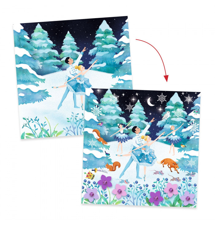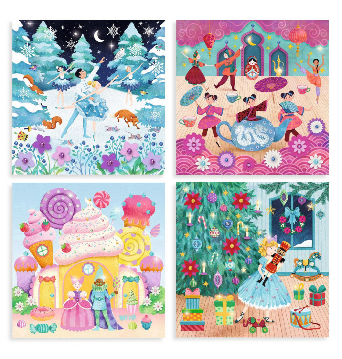 Entra nel magico mondo de Lo Schiaccianoci! Con Casse-Noisette, i bambini possono decorare splendide illustrazioni ispirate a uno dei più celebri balletti classici. Utilizzando décalcomanie (trasferelli), fiori di carta, strass adesivi e motivi metallizzati, danno vita a quattro scene iconiche — un’esperienza scintillante che unisce quattro tecniche creative in un unico, incantevole cofanetto!