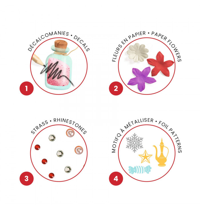 Contenuto 4 tavole illustrate da decorare Décalcomanie (trasferelli) Fiori di carta Strass adesivi Fogli metallizzati 1 libretto esplicativo illustrato
