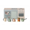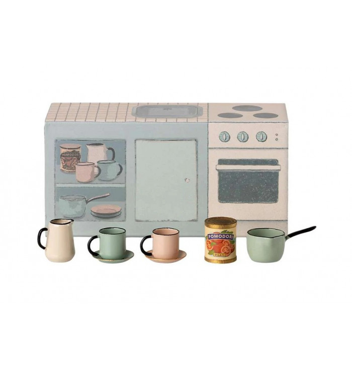 Un mini bancone da cucina completo di tutto il necessario per dare vita alle storie più dolci: include 2 tazze, 2 piatti, una pentola, una brocca e una piccola lattina. Il lavello in metallo aggiunge un tocco realistico e irresistibile.