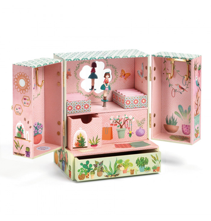Jardin secret è un carillon splendidamente illustrato con tre cassetti in cui custodire gioielli e segreti. Girate la manovella, aprire le porte di questo grazioso negozio e... sorpresa! Una fanciulla finemente scolpita volteggia e si riflette su uno specchio sagomato al suono della musica de "Invitation à la valse" di Carl Maria Von Weber